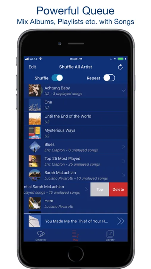 HiChord does it in a completely new way. All playable music units, regardless song, album, playlist, artist or genre, are treated equal. They can be added to queue, play and managed. Collection items will have a second level queue. This Deep Queue or 2-level play queue technology enables you to play, shuffle, skip, move back and forth with all kinds of music unit. Album shuffle is done beautifully, you don't have to any setup to make it work. Go to Library, swipe to album list, tap "Shuffle", that's it. Want to change to Playlist Shuffle? Swipe back to playlist lists, tap "Shuffle", done. Browse through your library, play some artist, or genre, or plain songs, just tap the artwork in the list, they will be played, all together with the albums or playlists you just selected to shuffle, together.