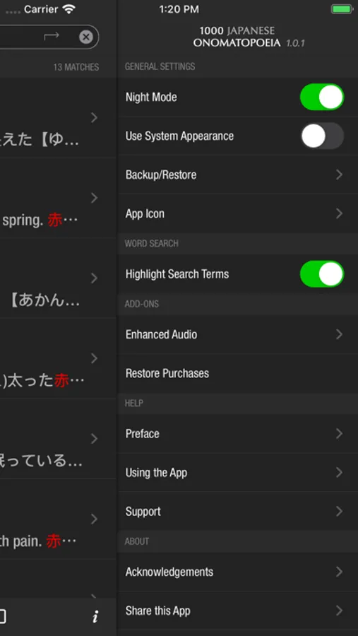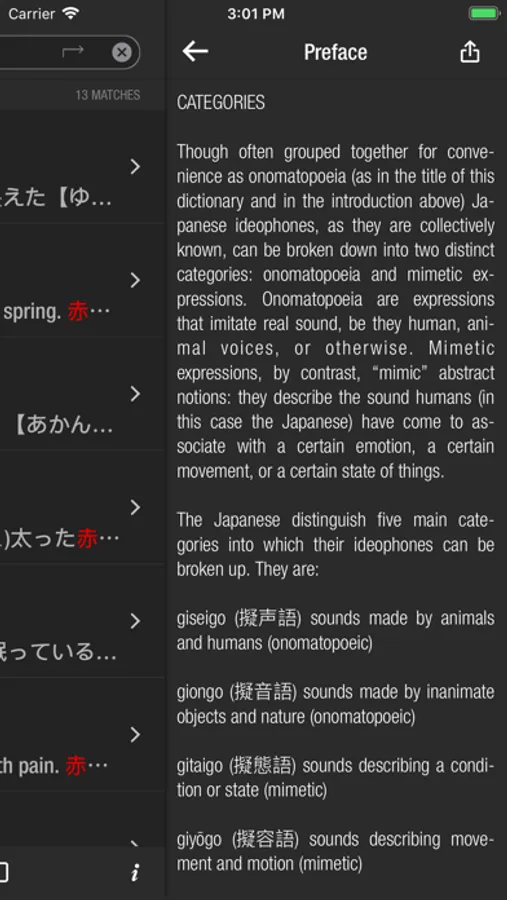 This is the first comprehensive dictionary of Japanese onomatopoeia. Multiple English sample sentences highlight every meaning and nuance of expressions, and furigana (as well as audio) allows even beginners to correctly pronounce and use the phrases immediately. Other app features include: