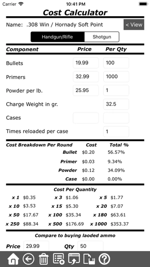Reloading Assistant is the perfect companion for your ammo reloading needs. The reloading calculator is used to determine the cost to reload each round, breaking each component down and displaying its cost.