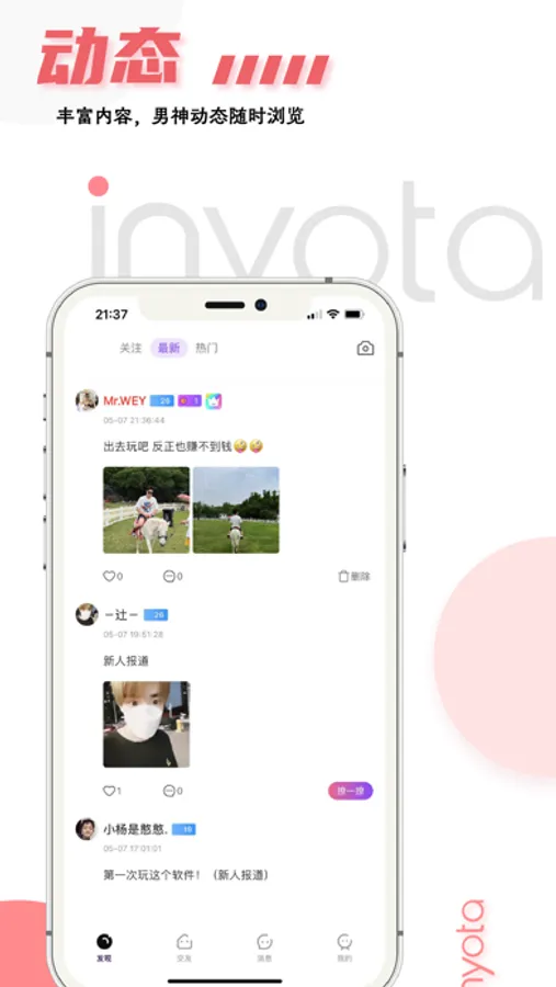 INYOTA是一款绿色干净的同志社交软件,致力于打造干净,有趣的同志交友环境,通过INYOTA你可以找到兴趣相同人,查找发现身边好基友,也可以找到随时诉说陪伴的有趣灵魂!