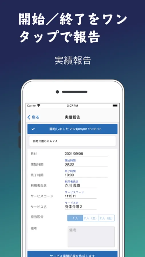 スケジュール、利用者を選んでボタンをタップするだけで作業の開始、終了が報告できます。