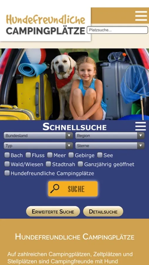 Auf zahlreichen Campingplätzen, Zeltplätzen und Stellplätzen sind Campingfreunde mit Hund besonders willkommen. Spezielle Angebote für die vierbeinigen Gäste wie Freilaufflächen, Hundeduschen, Hundeschulen oder Hundespielplätze machen den Aufenthalt für Mensch und Hund erst richtig schön. Hier finden Sie hundefreundliche Campingplätze, die Ihnen die Urlaubsplanung mit Hund erleichtern. Viel Spaß beim Campingurlaub mit Hund!