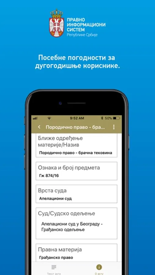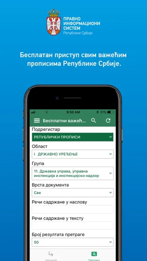 Aplikacija omogućava objedinjenu pretragu svih sadržaja u Pravno-informacionom sistemu RS. Pretplatnici na elektronske baze mogu koristiti svoje korisničko ime i lozinku i u okviru iOS aplikacije i na taj način, u obimu svoje pretplate, pristupiti aktima sadržanim u pojedinačnim bazama, i to: