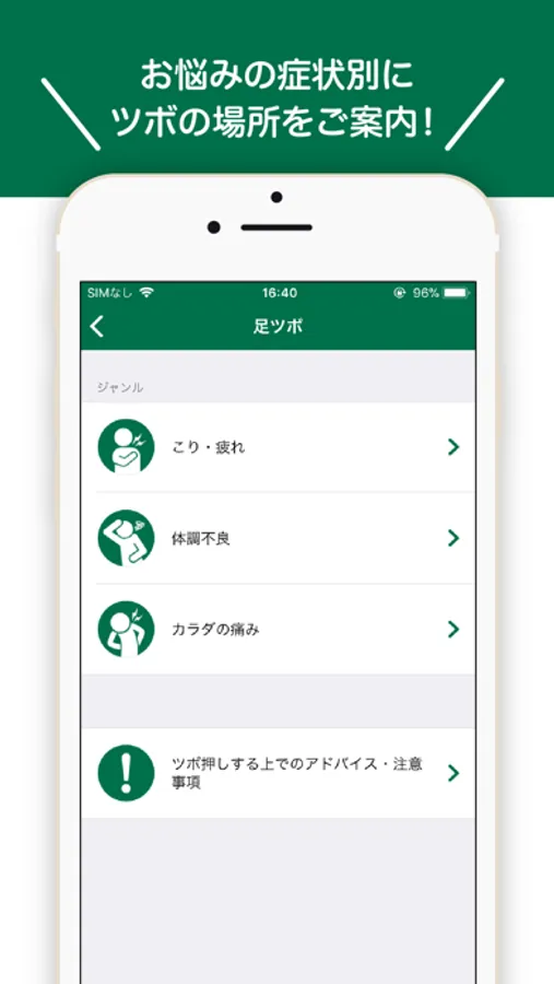 あしカラダアプリでは、症状に応じた足ツボに関する情報を確認することができます。