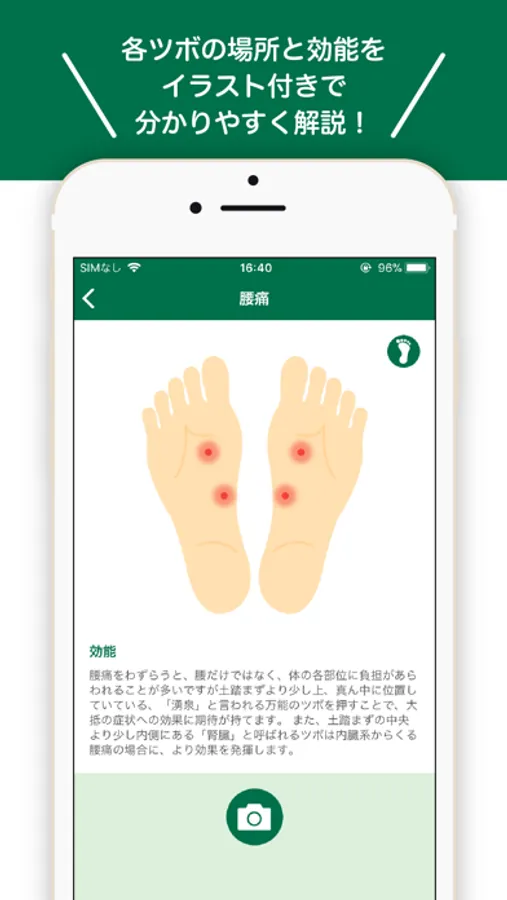 このボタンをタップすると足ツボの位置が表示されたカメラが起動し、