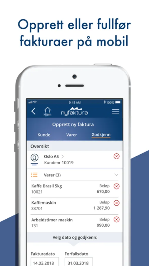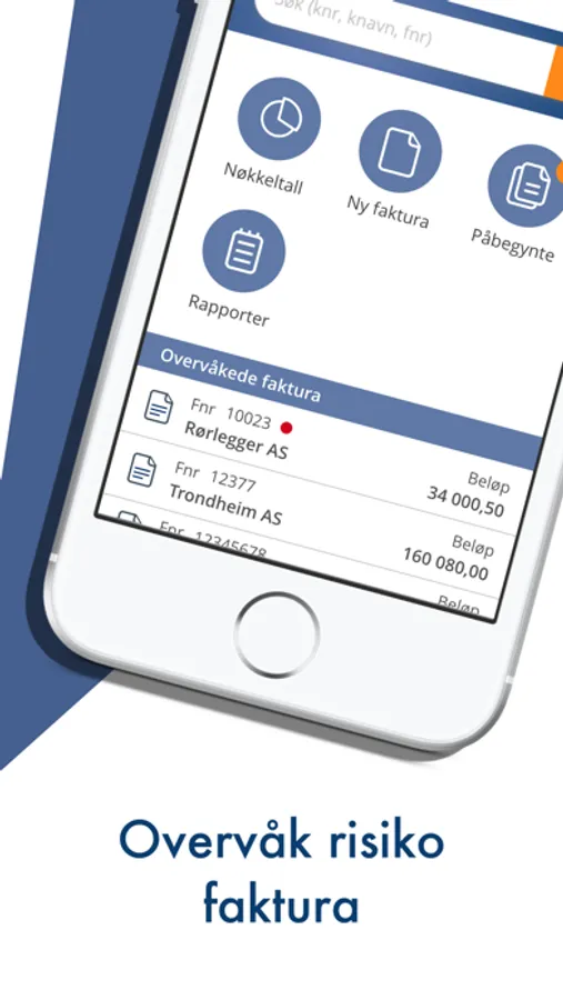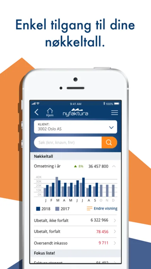 Nyfaktura appen gir deg en enkel oversikt over status på dine faktura og kunder. Du logger inn med et tastetrykk og har alltid tilgang til dine data. I appen kan du se nøkkeltall, søke opp kunder og deres faktura for å se status. Videre kan du merke de for overvåking og beslutte handlinger på en faktura. Du kan også opprette faktura/kreditnota og ta ut rapporter.