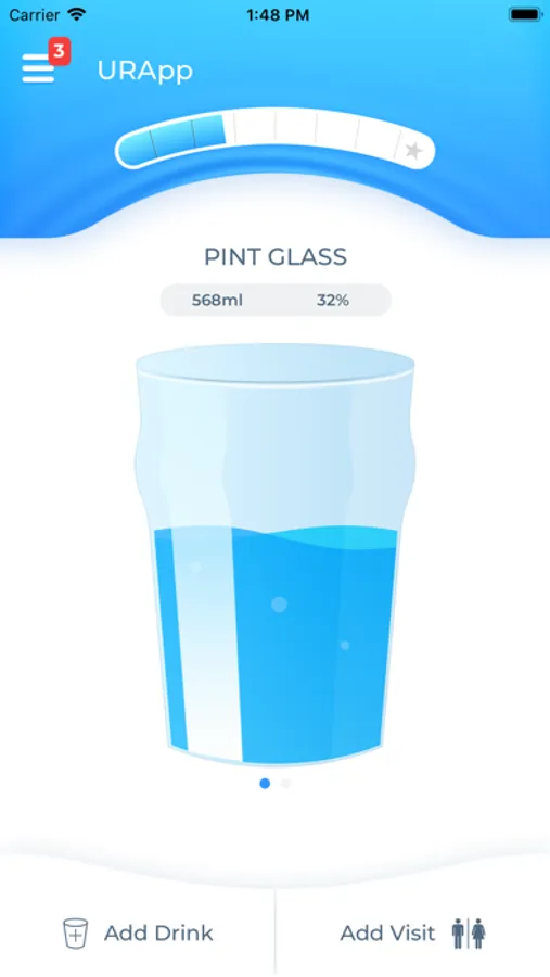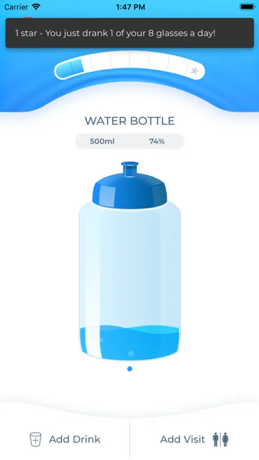 Information about toilet visits and progress towards drinking goals is recorded in charts.