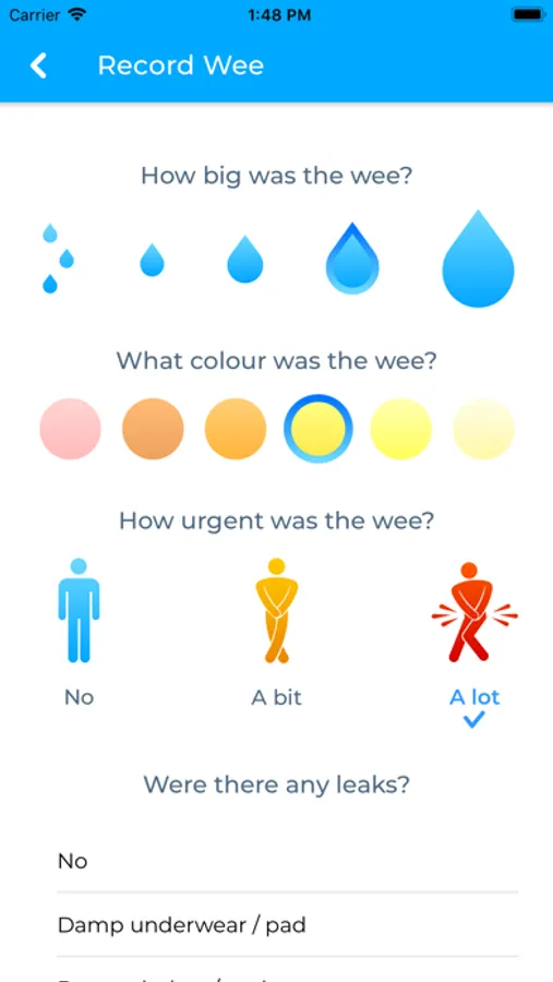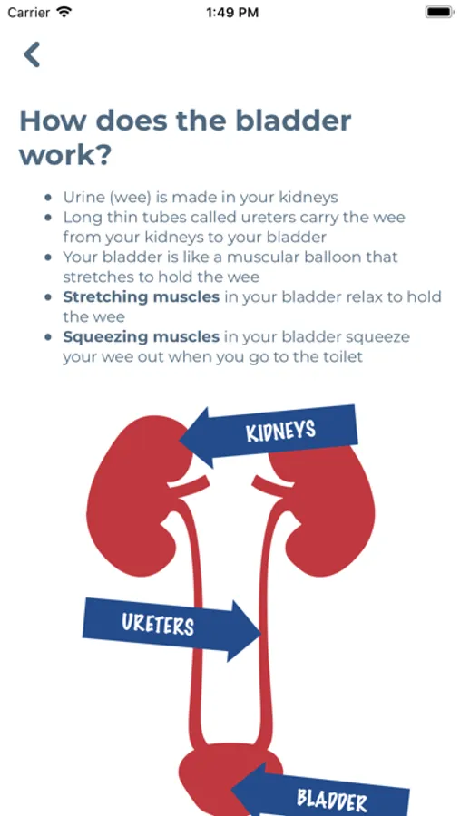 Common bladder problems include needing to wee urgently, weeing frequently and urinary incontinence. URApp is designed to support bladder training by providing reminders to drink at regular intervals throughout the day and to empty the bladder regularly. URApp also includes a diary to record daily drinking, toilet visits and other important details.
