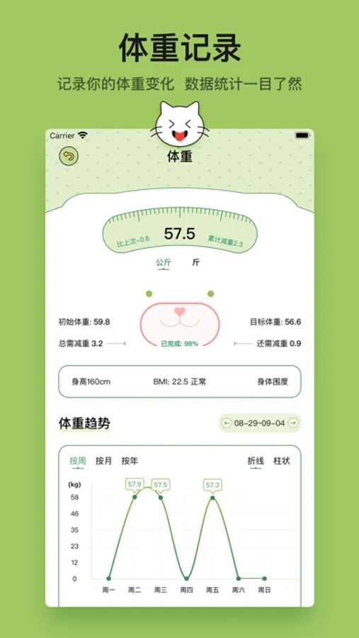 - 体重:选择场景,记录体重,按周、月、年多维度自动生成折线/柱状 趋势图