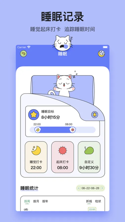 - 睡眠:设置睡眠目标,睡觉、起床一键打卡,轻松生成睡眠图表数据