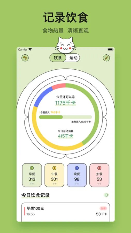 - 饮食:记录饮食,15w+食物热量库,每天的摄入情况清晰直观
