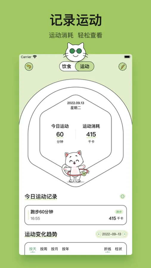 - 运动:记录运动,消耗的卡路里,折线/柱状图一目了然