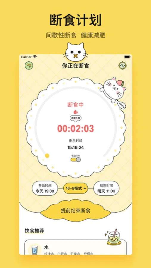- 断食:内置10多种断食计划,日计划、周计划、自定义任意选择,灵活性更高