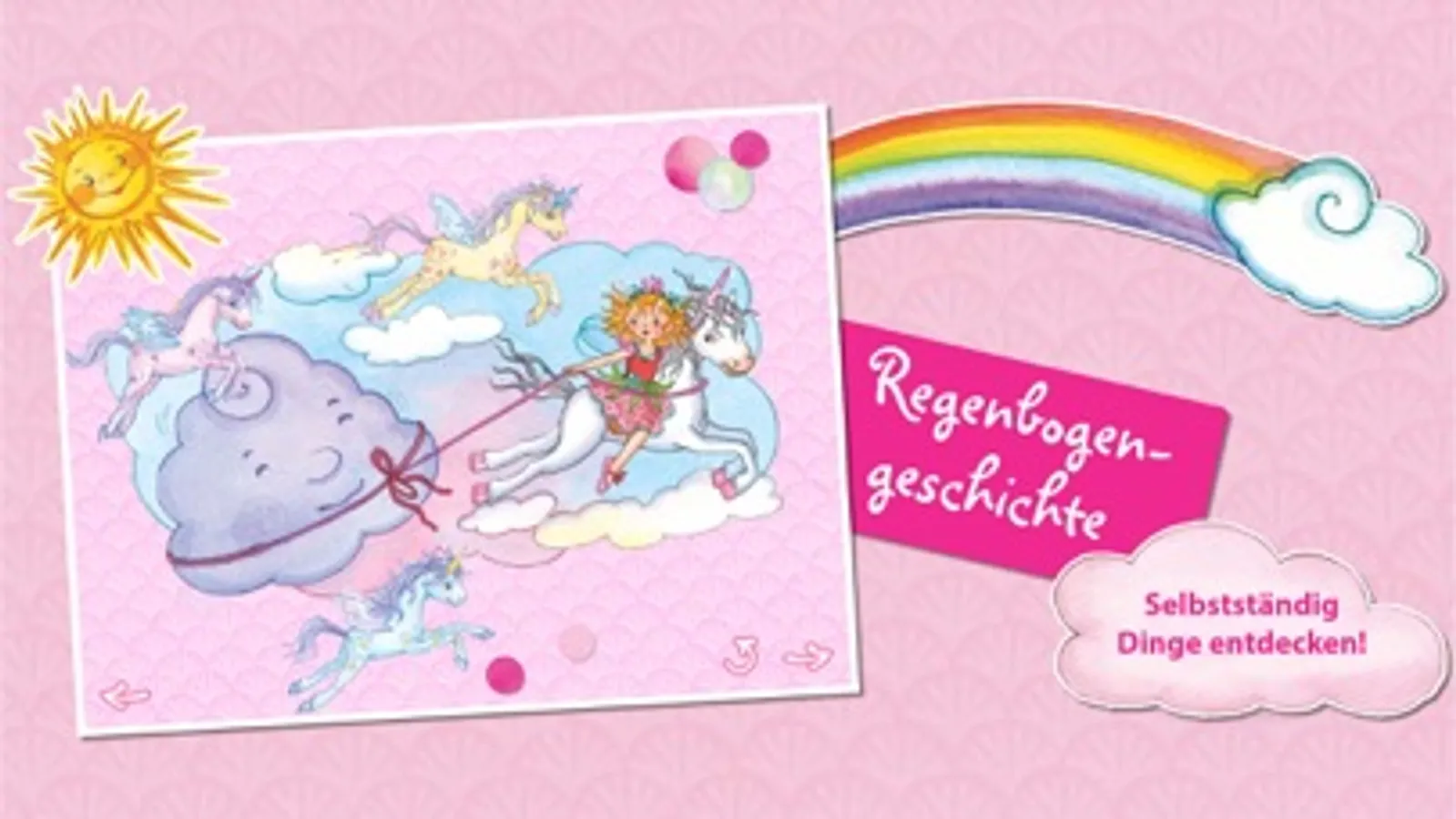 Entdecken, spielen und kreativ werden: Eigene Geschichten mit süßen Stickern erzählen, einen farblosen Regenbogen gemeinsam mit den Einhörnern und der kleinen Fee zum Strahlen bringen und süße Animationen, Melodien und Geräusche in der Geschichte „Magischer Regenbogenzauber“ entdecken.