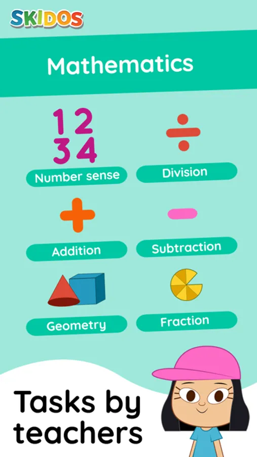 MATH: Our math exercises cover a comprehensive list of topics including number sense, addition, subtraction, multiplication, division, geometry, etc. Tasks evolve as a child progresses. Interactive design and animation support learning - three cute little SKIDOS mascots help and encourage kids when they work on the assignments.