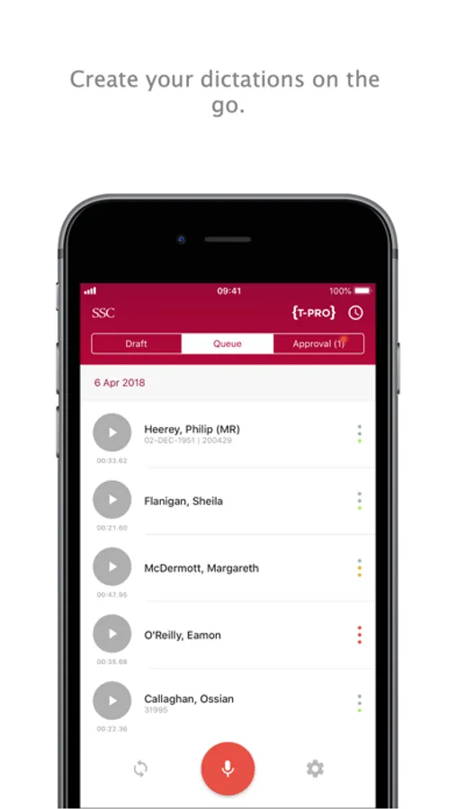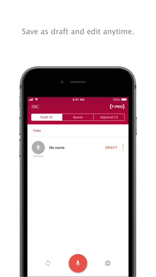The SSC Dictate by T-Pro iOS app allows users to create dictations on the go, and securely send them the the T-Pro platform for processing. Uploaded dictations can be tracked as they are processed by transcription teams or T-Pro's back-end speech recognition servers.