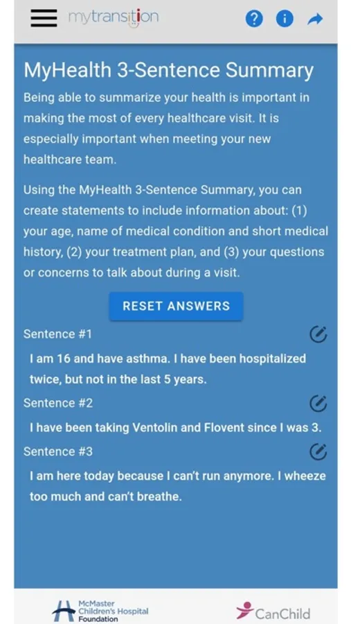 - MyHealth 3-Sentence Summary: a way to summarize your health information to help you speak with doctors, nurses or therapists;