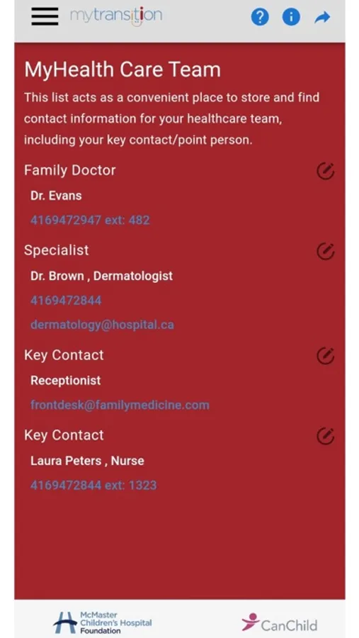 - MyHealth Care Team: a place to enter contact information for your health care providers;
