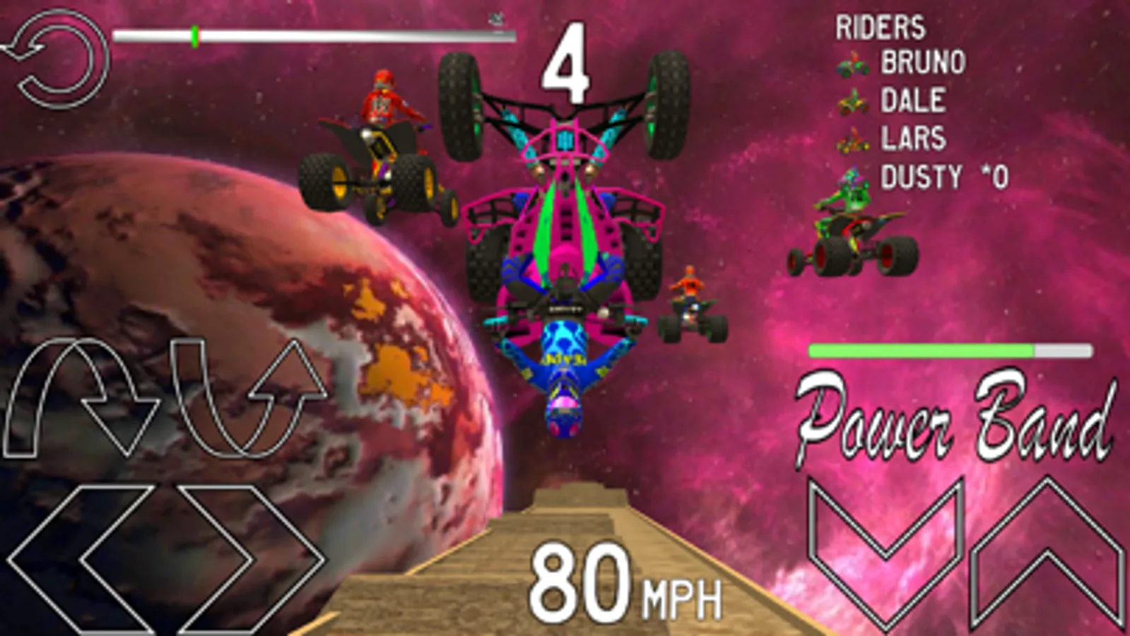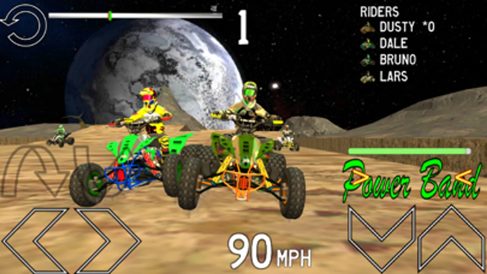 ATV offroad racing with 3D graphics and multiplayer. Fast paced 4-wheeler racing will keep you on the edge of your seat. Hold on tight and hit the Power Band for an explosive burst of nitrous speed. Get massive air and pull off nasty stunts to fill your Power Band bar. Race your friends and people from all around the world in Multiplayer Mode. Play Championship mode to unlock up to 50 tracks. Earn coins to buy up to 100 rider-atv style combos and 5 incredible race locations.