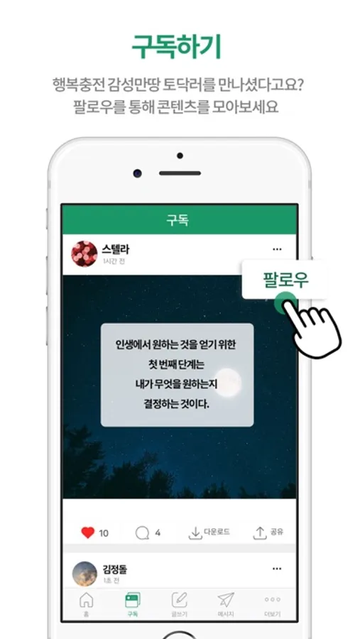 - 팔로우 기능을 통해 행복충전 감성만땅 감성 콘텐츠를 모아보세요.