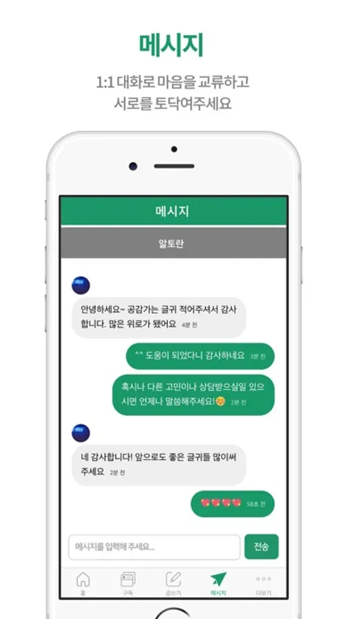 - 여러분의 고민, 근심, 걱정, 경험 등 필요한 이야기들을 주고받아보세요.