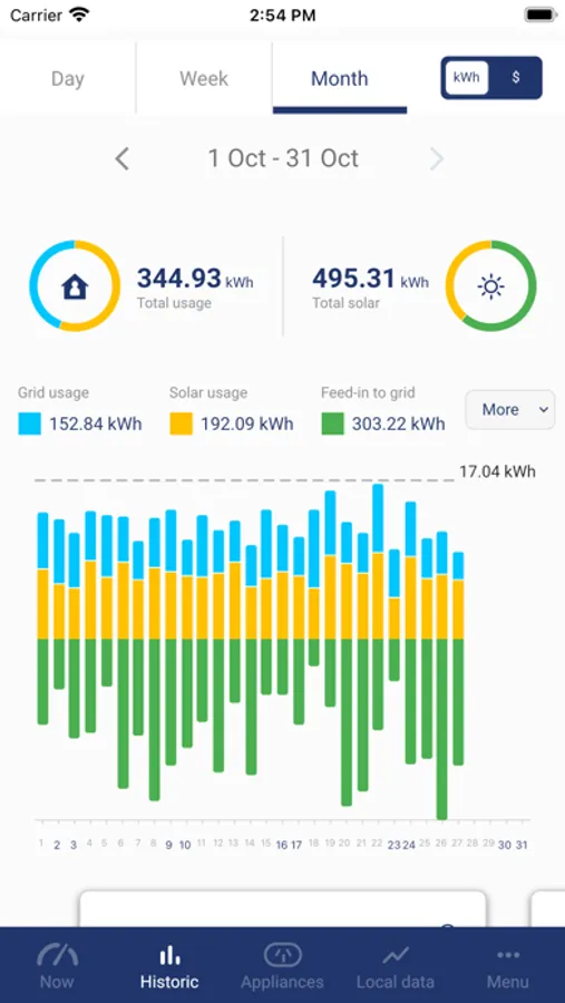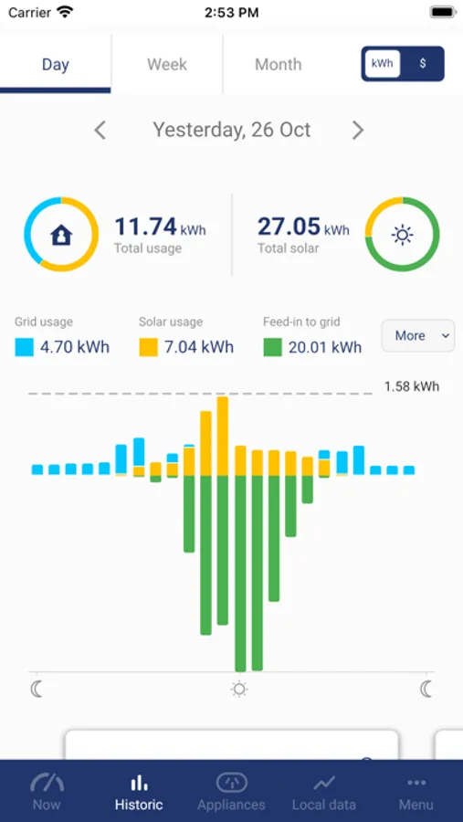 View live and historic trends of whole-of-house or individual appliance energy consumption in our free mobile app, no subscriptions required.