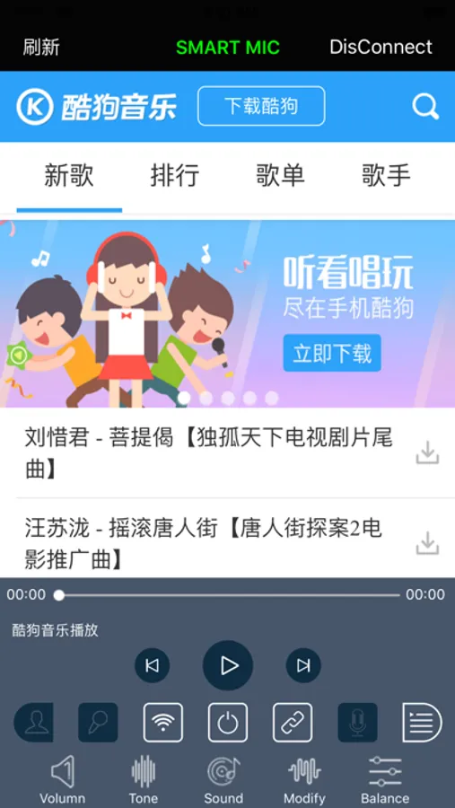 通过蓝牙连接MP3播放器和无线麦克风。用APP软件来控制和操作MP3播放器和无线麦克风的功能。