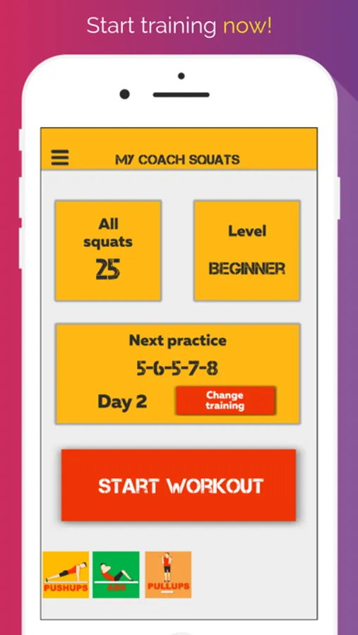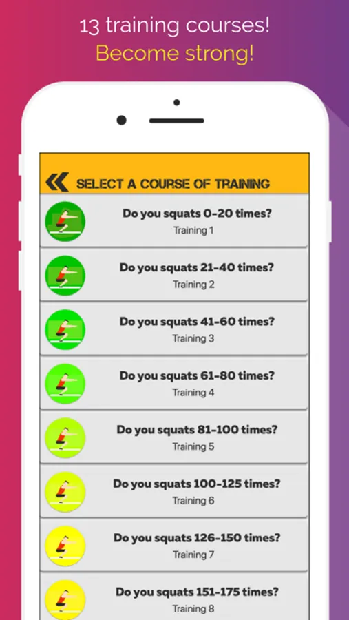 This application includes 13 courses training from beginner to athlete. You just need to choose the suitable for you, depending on your level of training.