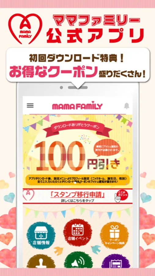 「ママファミリー」公式アプリでは、各店舗の最新情報やアプリ限定のお得なクーポンを随時配信しています。