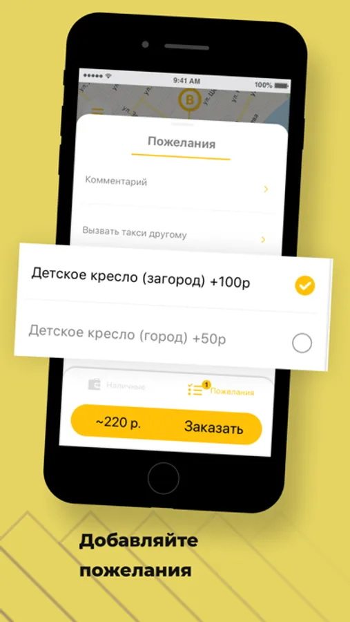 Добавьте к заказу дополнительные пожелания. Например, когда с собой много сумок — выберите "Багаж". Если с вами ребенок — укажите "Детское кресло".