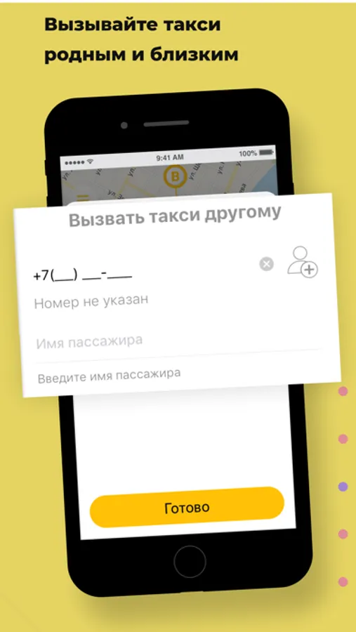 Используйте опцию “Вызвать такси другому” в разделе “Пожелания” и укажите его номер телефона. Когда такси подъедет, на указанный номер придет СМС, а вам — сообщение в приложении.
