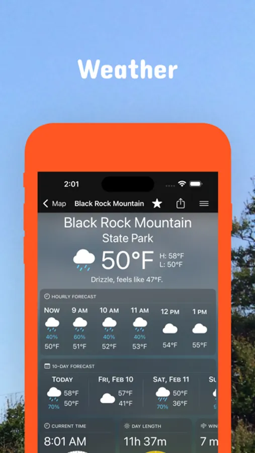 - Current weather conditions, easy access to multi-day forecasts, sunrise and sunset times.