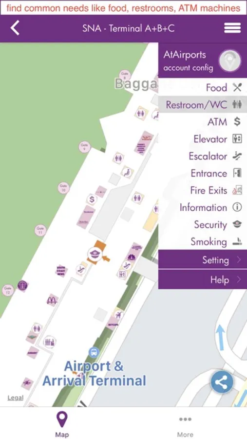Find commonly needed facilities like restrooms, ATM machines for quick cash, elevators for handicap access, taxi stands, etc.