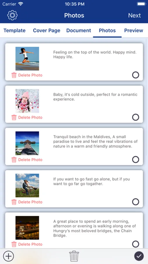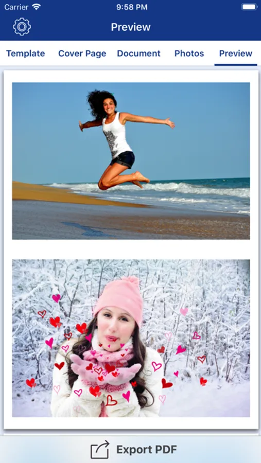 The app offers single photo per page layout, photo grid layout and photo with text layout. You can also customize page header, page footer, page orientation and margins before exporting the PDF document.