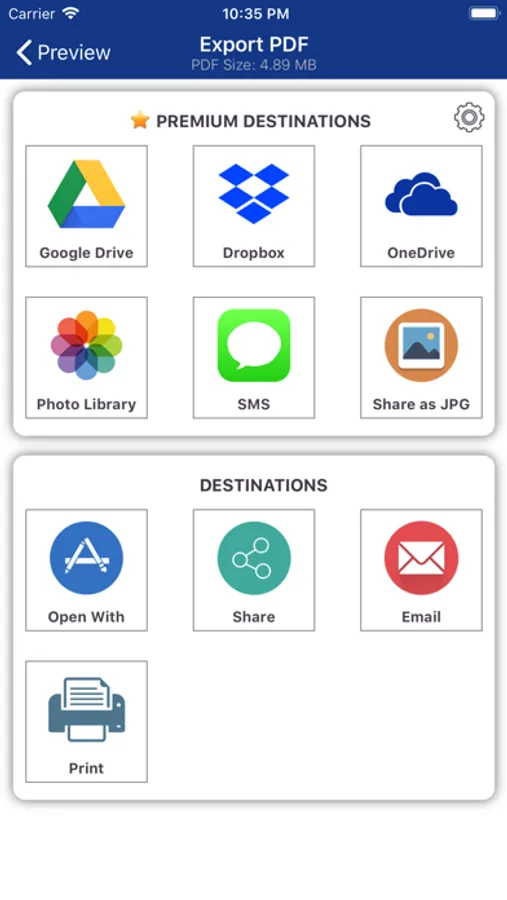 Export PDF document to Google Drive, OneDrive and Dropbox. You can easily print, email, sms or open PDF document with other PDF reader applications. You can also export all the pages to JPG images and save them to your Photo Library.
