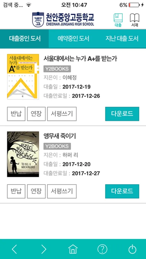 - 대출/반납/예약/연장시 네트워크에 반드시 연결되어야 하며, 다운 받은 도서의 책읽기 시에는 네트워크연결이 되지 않아도 대출기한까지 이용 가능합니다.