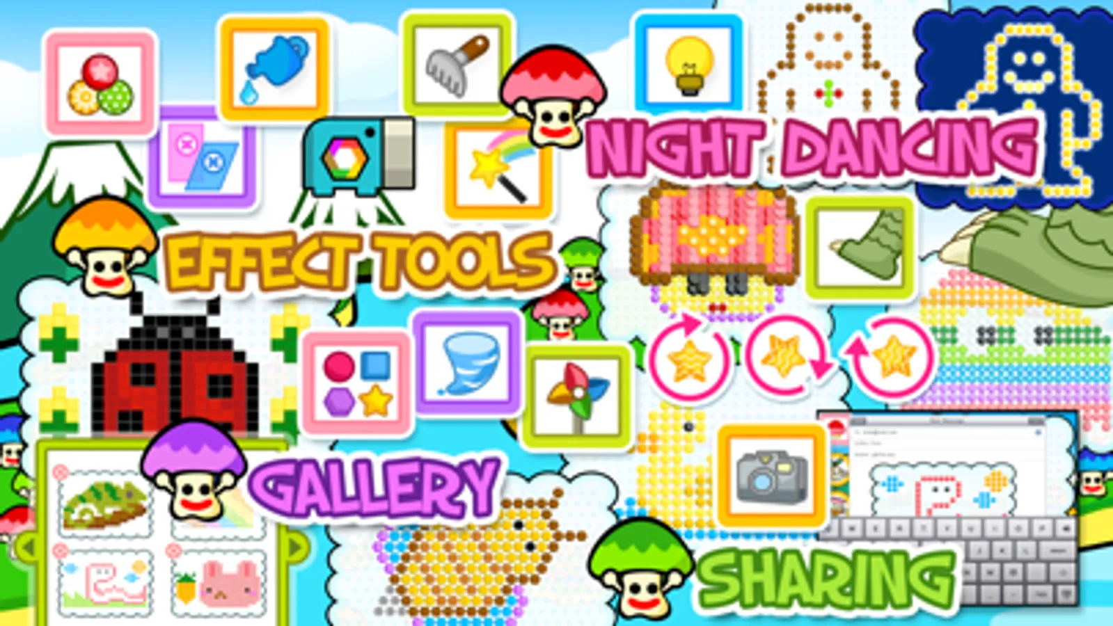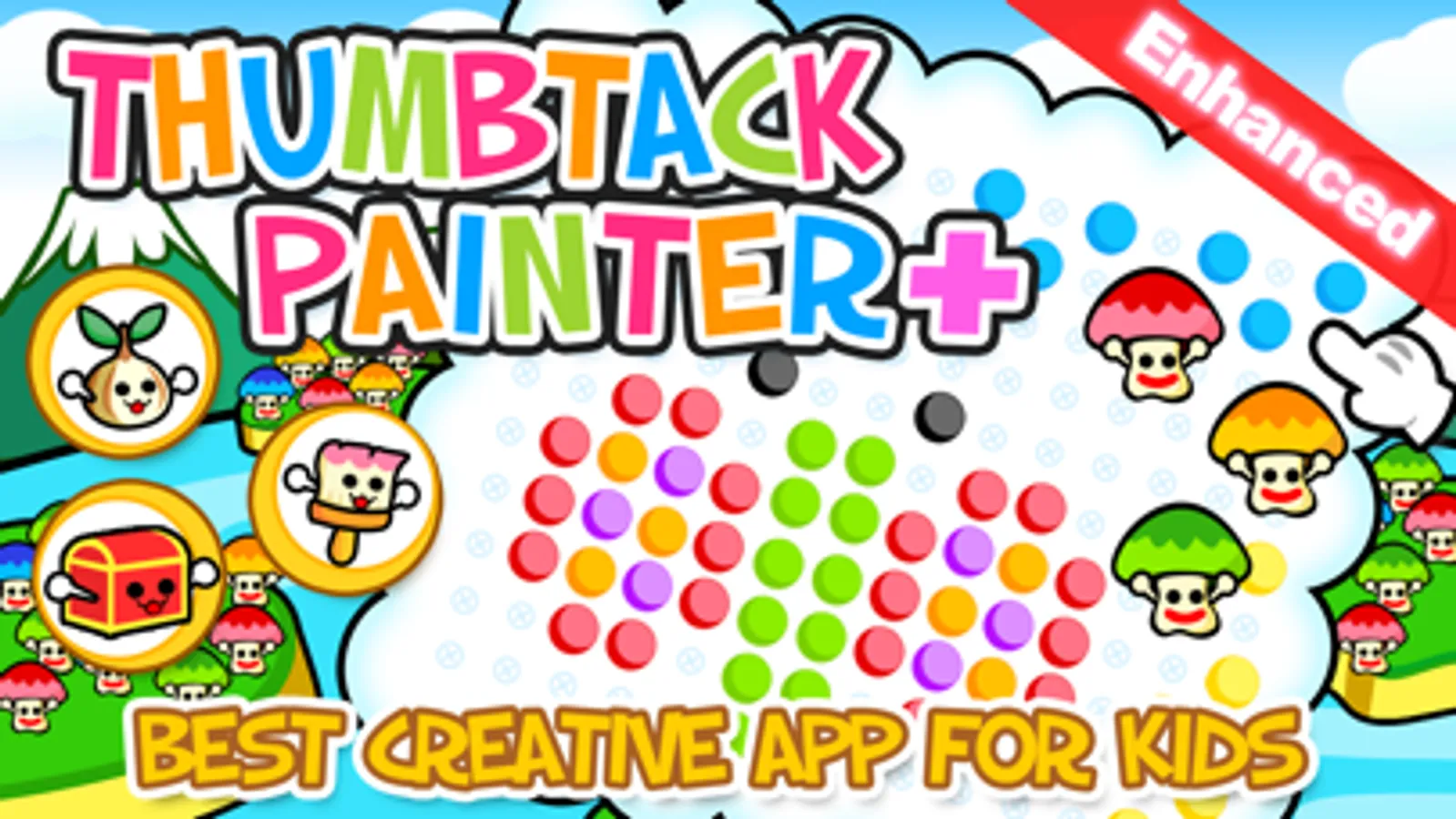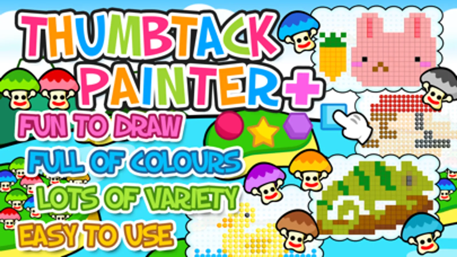 Thumbtack Painter Plus, one of our creative kit series apps, enables children to create and share their very own pictures by manipulating mushroom tacks of plenty colours and various special effect tools.