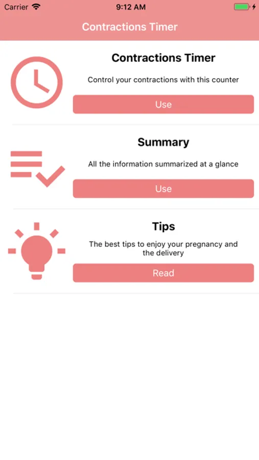 1.- Once you have downloaded the app, you will see that there are various options in the main menu: the contraction counter, the contraction tracker and tips.