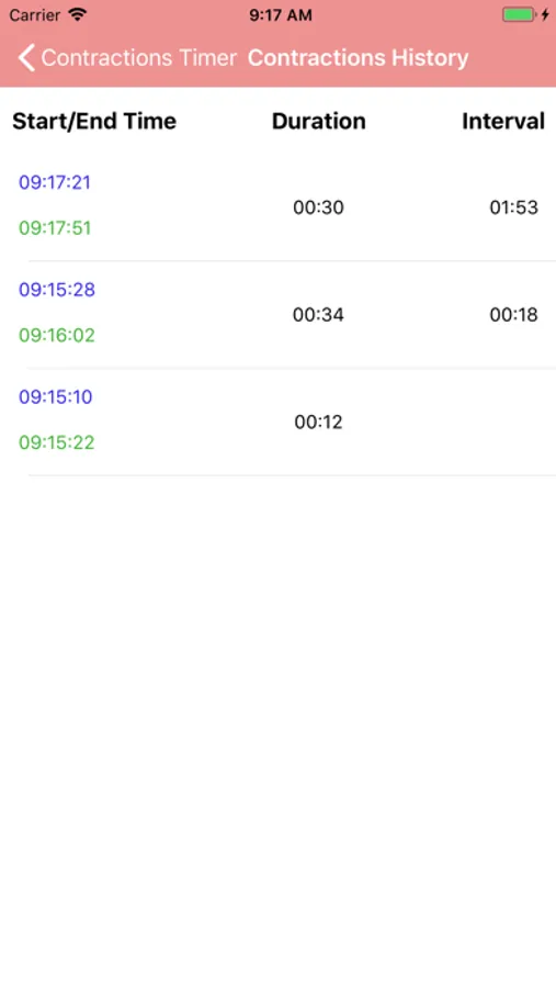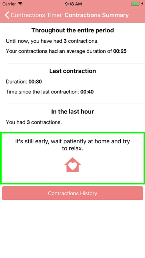 3.- Contraction tracker: Here you will find a summary of everything you have registered so that you can keep track of all your contractions. You might have contractions without pain during your pregnancy (or even false contractions) you don't notice, but don't worry, the important ones will be those in the final stage of pregnancy.