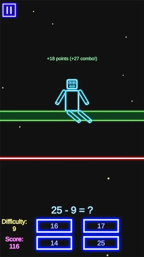 You have to keep Neon Man away from the laser. Because the laser melts Neon Man. But he can regenerate again. If you answer questions correctly, you will make combos and gain more points. Also you can colour Neon Man as you wish with the points you gain.