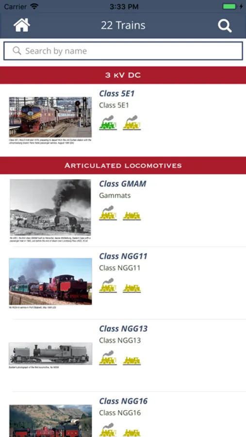 SmartSearch Trains of South Africa is a sophisticated tool for smart phones and tablets to identify and learn about the trains and motive power of South Africa. You can choose your location to find trains that could be found near you and a powerful search function will allow you to filter by status, operator, manufacturer, wheel arrangement and much more.