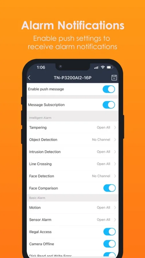 - Intelligent Alarm Notifications: Exception, Object Detection, Intrusion Detection, Line Crossing