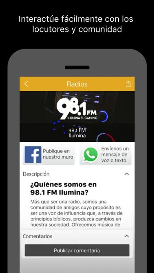 El app oficial de la Comunidad Virtual de las radios 98.1 FM Ilumina, 99.7 FM El Camino y Celebra FM, transmitiendo desde la ciudad de Guatemala, Centro América.