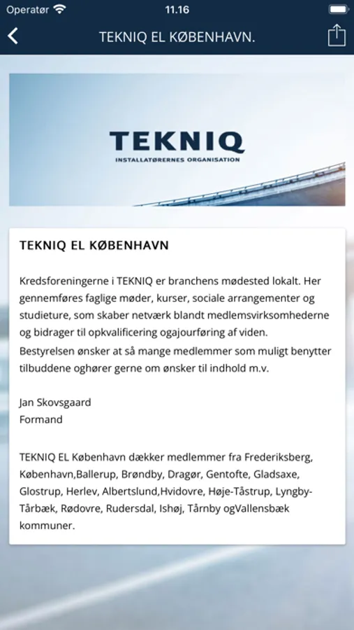 TEKNIQ EL København dækker medlemmer fra Frederiksberg, København, Ballerup, Brøndby, Dragør, Gentofte, Gladsaxe, Glostrup, Herlev, Albertslund, Hvidovre, Høje-Tåstrup, Lyngby-Tårbæk, Rødovre, Rudersdal, Ishøj, Tårnby og Vallensbæk kommuner.
