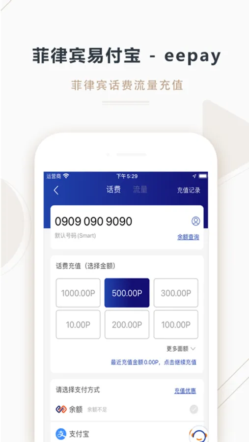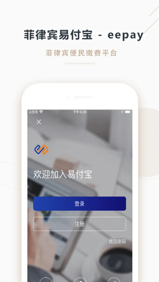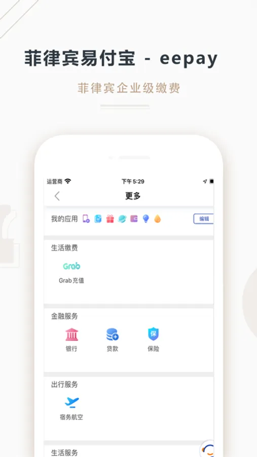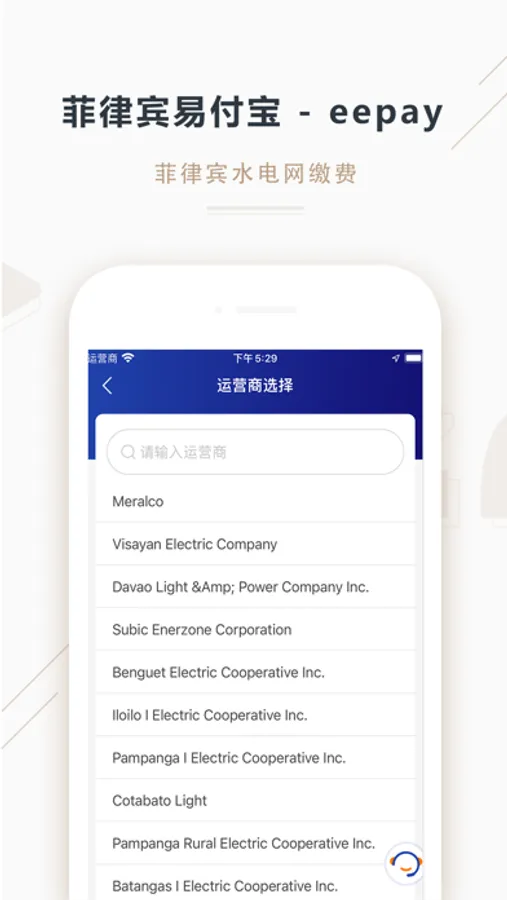 eepay是一款为菲律宾华人提供便捷自助话费充值和生活账单缴纳的app,一个app即可完成水电网账单缴纳。手机号码只针对菲律宾本地号码,面对的对象主要在活跃在菲律宾并拥有微信和支付宝的华人。