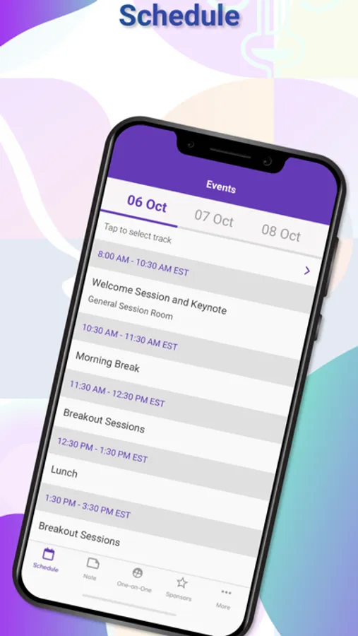 • Agenda: View the full agenda for the event, from session times to room locations.