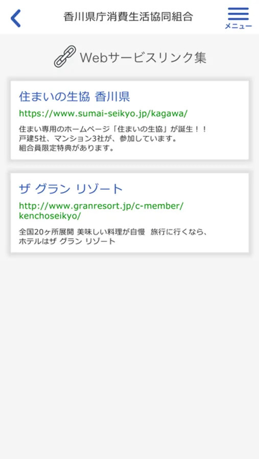 組合員証の表示の他に、Web サービスリンク集、指定店・契約指定店のご紹介、お得なデジタルクーポンのご提供など、多彩なコンテンツもございます。