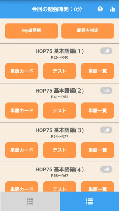 「単語カード」や「テスト」で表示・出題する単語の範囲を、