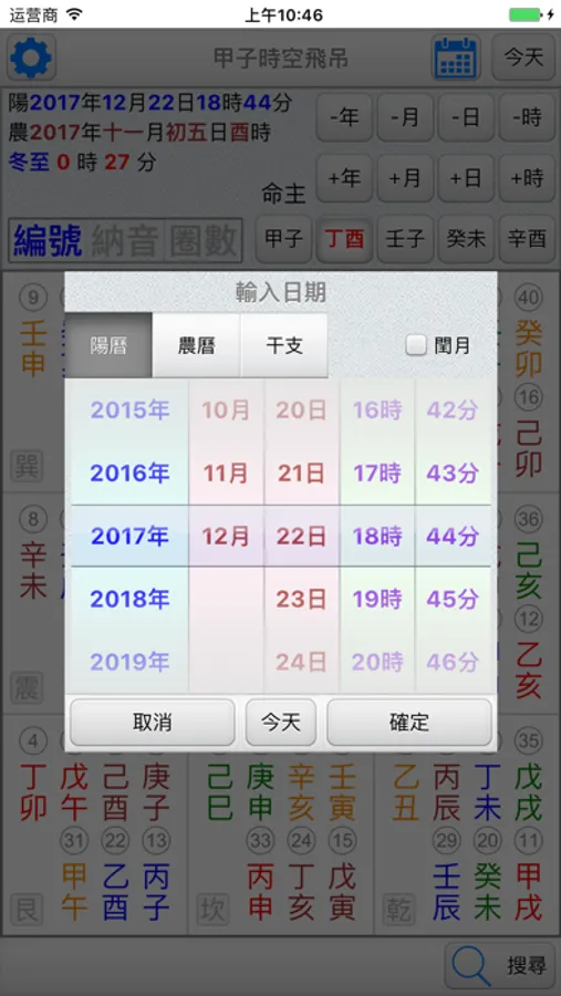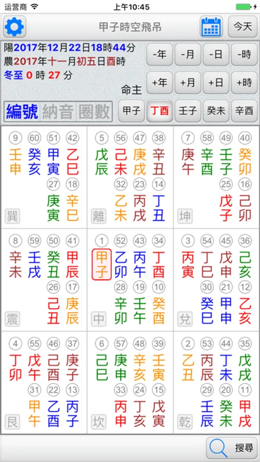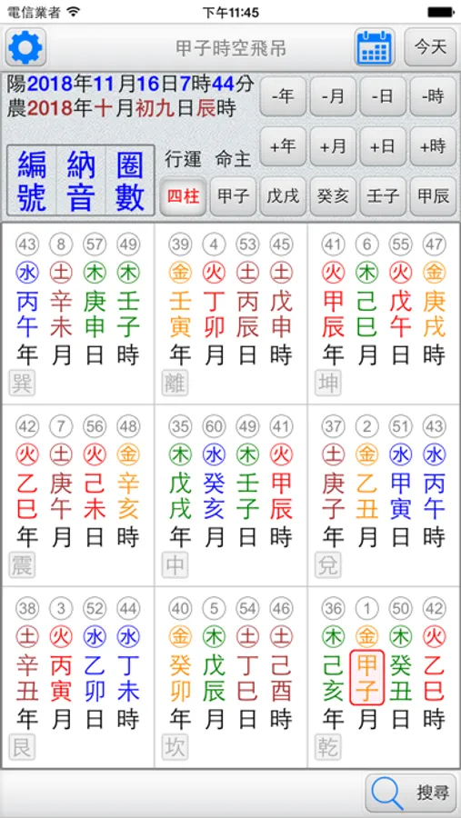 ●輸入命主干支入中,排出分佈於九宮的六十甲子。