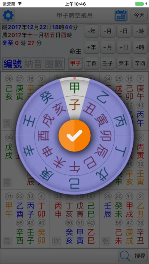 ●顯示甲子的「納音五行」(並以顏色區分納音五行)。